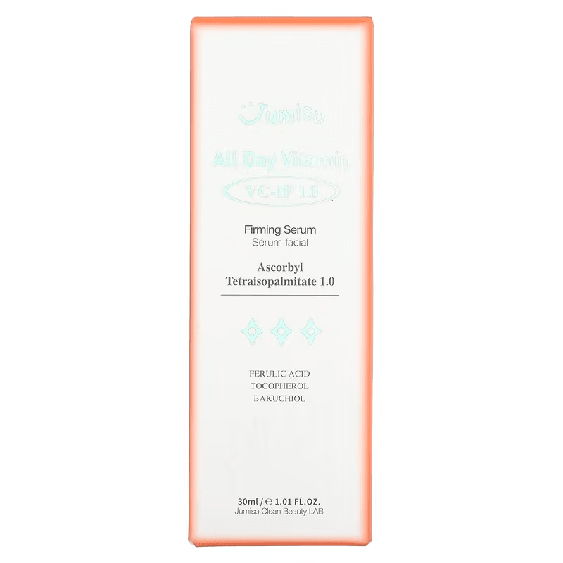 Obtén una piel más firme y radiante con el Suero Reafirmante Antiedad JUMISO All Day Vitamin VC - IP 1.0. Este suero antienvejecimiento está diseñado para desvanecer las manchas oscuras y brindar una apariencia rejuvenecida.El ingrediente principal de este suero reafirmante y antiedad es el tetraisopalmitato de ascorbilo, una forma de vitamina C clínicamente probada para aumentar la producción de colágeno en 2.6 veces. Esto ayuda a reducir la visibilidad de las líneas finas y los signos del fotoenvejecimiento, ¡dándote una piel más tersa y juvenil en poco tiempo!